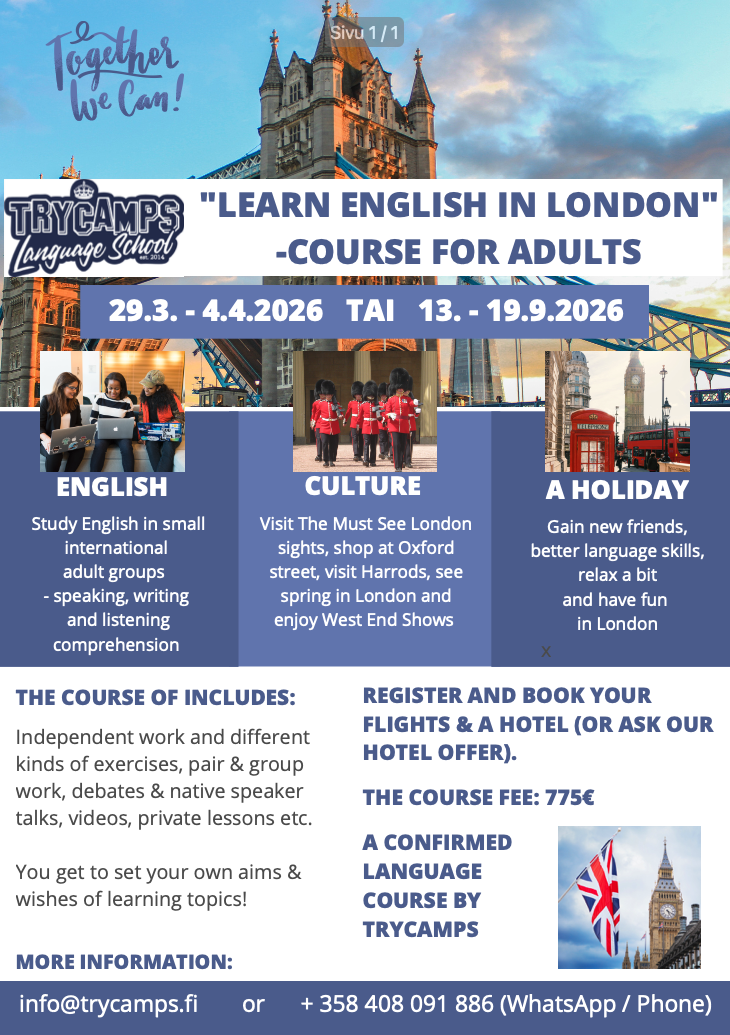 TRYcamps4Adults -kielikurssit on tarkoitettu kaikille yli 18-vuotiaille, joilla on pohjaopintoja englannin kielessä. Tavoitteenamme on tarjota aikuisille mahdollisuus rikastuttaa ja aktivoida omat enkkutaidot. Saat itse valita, keskitytkö kirjallisen vai suullisen kielitaidon parantamiseen. Kurssilla haluamme antaa jokaiselle osallistujalle rohkeutta käyttää englantia sekä lisätä kielen opiskelumotivaatiota.
